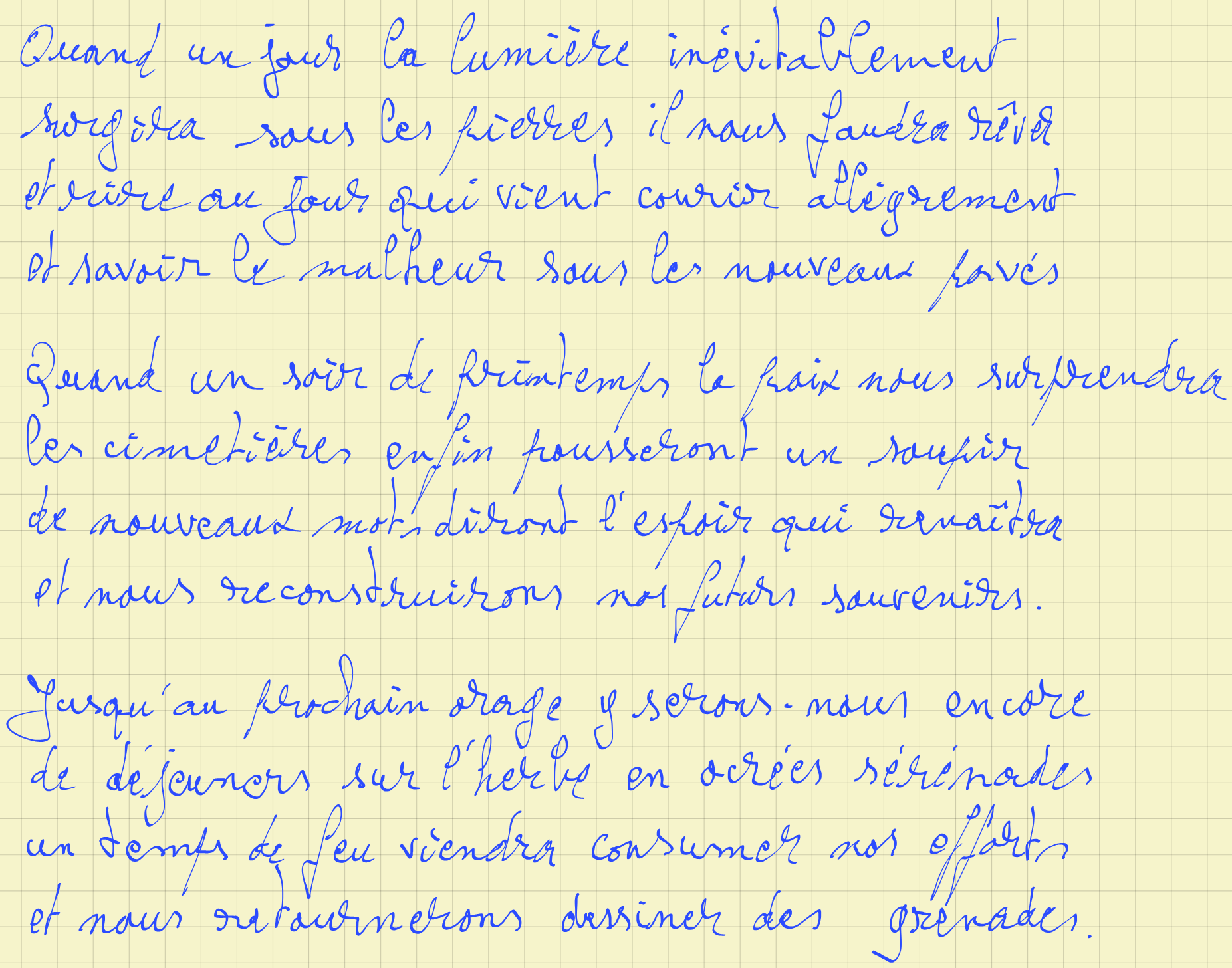 Étonnant poème, qui me fait aussi bien penser au rêve d’un jour sans guerre qu’à la vie surgissant après la mort (en première lecture, j’ai lu « de nouveaux MORTS diront l’espoir qui renaîtra »)…